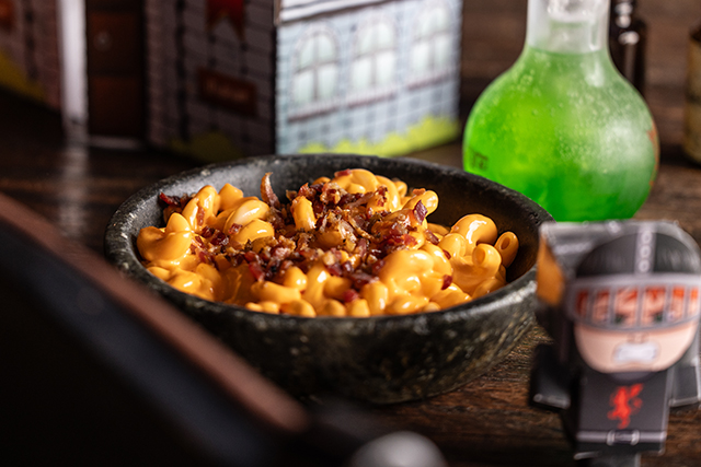 Hambúrguer bovino de costela (180g), cheddar empanado, queijo prato, cebola caramelizada, barbecue apimentado no pão australiano. Servido em cúpula de defumação.